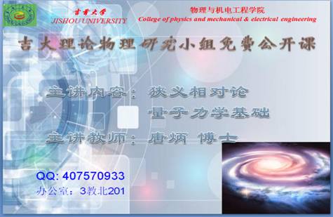 由理论物理学博士唐炳为导师的公开课使同学们能够有机会接触到这一门高深的学科,理论物理学是迷人的,因为它先存在于虚幻的理想世界,后通过人们一代一代的努力追求和不断超越,理论才能成为现实。而现今唐炳博士带领我们走进这一科学的殿堂,引领着同学们的兴趣,也同时向科学的发展注入新鲜的血液。