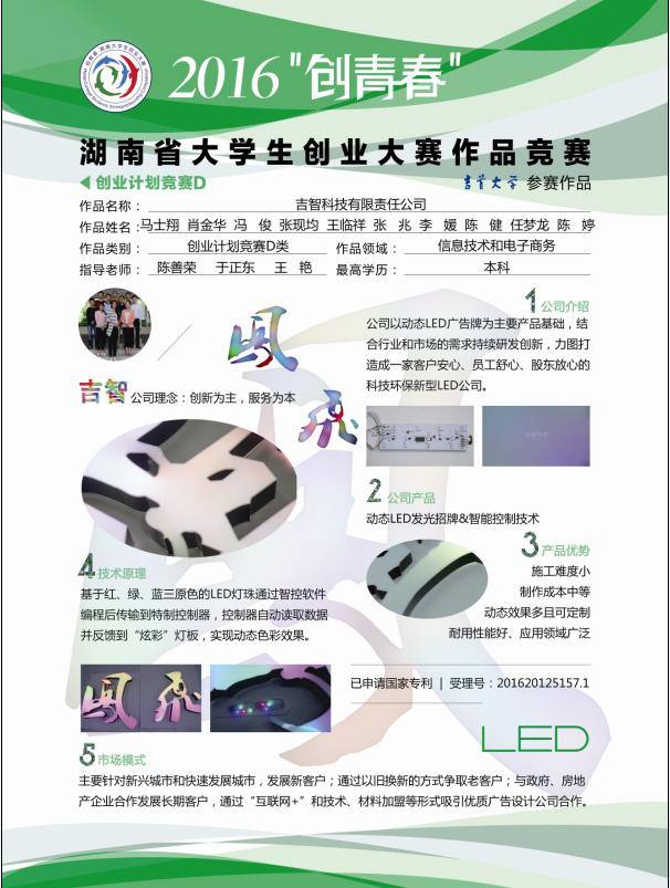 据悉,在他们的计划中,吉智科技有限责任公司是一家基于国家政策支持以及市场空缺,本着创新为主,服务为本的理念,用科技改变生活,做到极致服务,提供一种新型的具有动态效果的发光招牌服务。他们的服务内容包括:楼顶发光字、墙体发光字的LED灯模组、控制模块和相应的动态效果设计软件,并提供安装和售后维修服务。