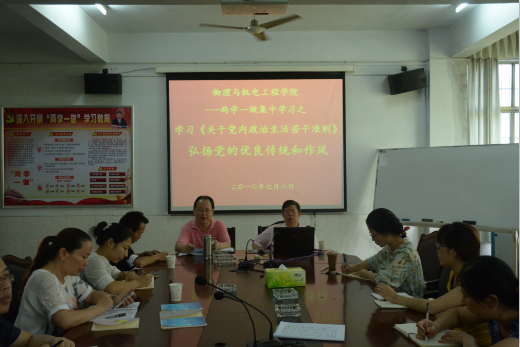 会议伊始,朱廷岚教授从三个方面带领我们学习《关于党内政治生活的若干准则》——新时期重温《准则》的意义;《准则》的内容;践行《准则》,严肃党内政治生活。《准则》的地位仅次于《党章》,它归纳了党内政治生活的十二条基本原则,是对党章的具体补充,是对处理党内关系的深刻总结;认真学习和坚决贯彻《准则》,对于改进作风、搞好党风,保持党的纯洁性和先进性,具有极为重要的现实意义;践行《准则》,严肃党内生活,认真学习是基础,狠抓落实是关键,监督执纪问责是保障。最后熊文斌书记提出殷切希望:希望在今后的学习生活中,党员们能认真勤奋不断提高,继续发扬笃实的精神对待“两学”,让党章党规、系列讲话成为党员们在做合格党员途中的“加油站”。