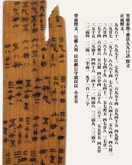 里耶简牍,纪年从秦王政二十五年至秦二世元年,记事详细到月、日,十几年连续不断。最让大家感到称赞的是,里耶秦简里还发现了我国最早的乘法口诀表。竹简上列出的这些乘法口诀与今天我们使用的乘法口诀如出一辙。