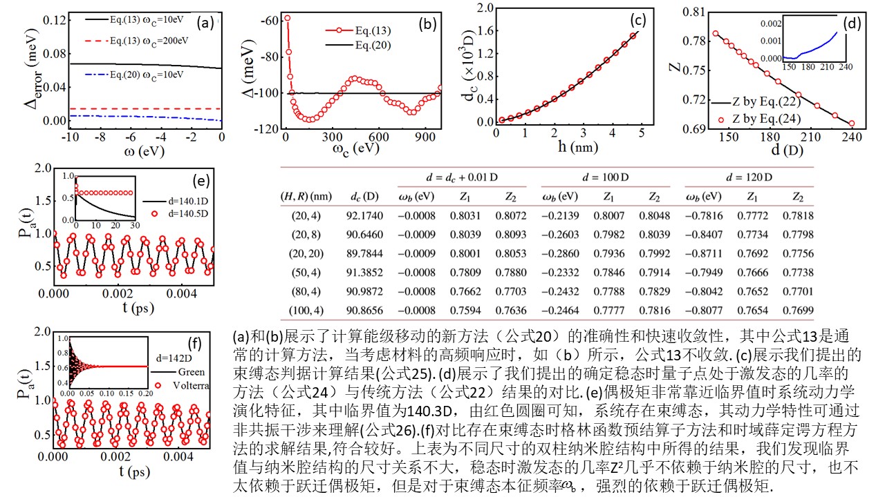 具体的,确定系统是否存在束缚态只需计算微纳结构中量子点处的0频光子散射格林函数(见公式25)。当系统存在束缚态时,我们提供了一种无需束缚态本征频率即可快速求解稳态时量子点处于激发态的几率(见公式24)。此外,我们推广了课题组之前所发展的快速准确计算能级移动的方法(Physical Review A 99(5), 053844 (2019)),发现了负频率时的能级移动与正频时能级移动的非共振项之间的相等关系(见公式20),相比于通用的方法(见公式13),该方法计算结果准确,收敛快(见图2和图7)。利用该结果,我们可快速准确获得束缚态的本征频率(公式21的零点)。利用所得的能级移动和束缚态共振频率,我们发现格林函数预解算子方法能快速准确求解系统的动力学,且系统的非马尔科夫动力学可通过公式26解释为非共振干涉。