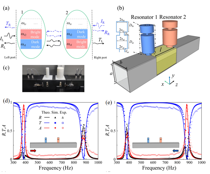 该研究工作利用一对含有不同辐射模式的多阶亥姆霍兹共振器和通风波导,在理论和实验上实现了多频带的非对称高效声吸收和反射。设计策略是在每个共振频率上实现声学亮模式和暗模式的耦合,避免组装多个功能单元所带来的复杂性,在仅使用两个多阶共振器的情况下也能实现更多频带的非对称吸收/反射。另外,通过灵活地部署多模对,构造了一个混合多带的非对称系统。混合多带非对称系统的一侧几乎完全地吸收低频的入射声波,反射高频的入射声波;相反,另一侧有效地反射低频入射波,同时吸收高频入射波。该研究工作展示了定制多频非对称吸收的灵活性,为通风型吸声器、声波操纵装置的设计提供了一种方法。
