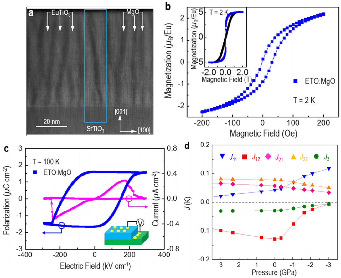 EuTiO3作为一类代表性的多铁性功能材料,在外力场环境下同时具有铁电性和铁磁性。传统上通常把EuTiO3薄膜生长在合适的衬底上,由界面之间的晶格失配产生的应力引起多铁相变,实现铁电铁磁共存现象,这种方法对EuTiO3薄膜厚度要求高,对产生晶格失配的衬底材料要求苛刻。另一方面,EuTiO3在外力场条件下发生多铁相变,是来源于第一近邻稀土金属直接相互作用,第二近邻Eu-O-Eu超交换作用还是对角线Eu-Ti-Eu交换作用,微观机制仍然不清晰。针对这些问题,杨超博士等人设计了三维垂直有序 (EuTiO3)0.5:(MgO)0.5纳米复合薄膜,在垂直有序纳米复合薄膜里实现了负压力效应,并通过负压力诱导的自旋-声子耦合以及面内-面外磁性相互作用的竞争耦合,实现了单相多铁性材料EuTiO3由顺电-顺磁序到铁电-铁磁序的相变。