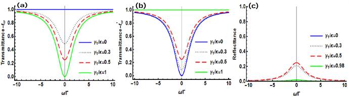 图1:透射系数(a)、(b)和反射系数(c)随光子入射频率与非线性谐振腔器的本征频率的失谐量