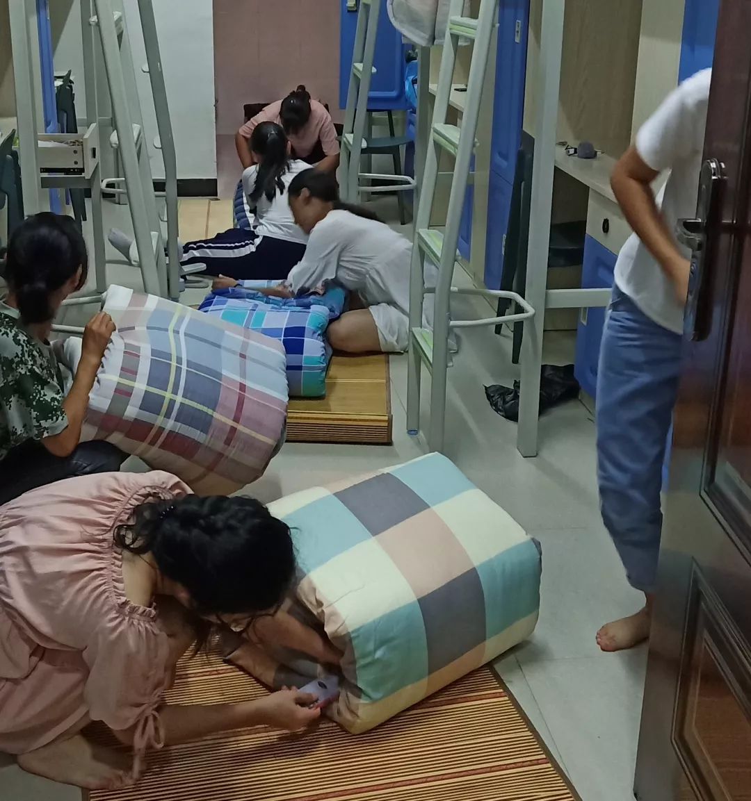 员工公寓里,带训教官对被子的折叠,日常洗漱用品的摆放,室内清洁程度统一做出规范:面对脏污,做到“看到,擦到,清洁掉。”床铺间,教官的一手“叠被子神技”让新生们叹为观止,整个过程里大家都十分配合和主动。地面被清扫了一遍又一遍,犄角旮旯也没有放过,书桌干净整洁,桶子摆放整齐。最后在新生的全方位打扫整理之下,整个寝室看起来焕然一新。