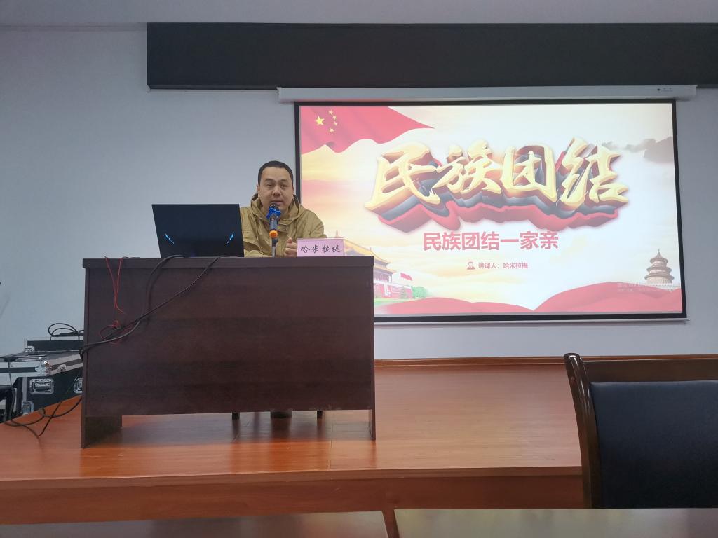 第一节课是由我们熟悉的哈米拉提老师给员工干部带来的关于民族团结的教育课程。他首先讲述我国民族成分及基本国情、分析影响民族团结的因素、谈论民族团结的重要性,最后希望各民族同呼吸、共命运、心连心。哈米拉提老师的讲课生动有趣,不仅让员工干部对民族关系有了更深入的了解,也引导了员工干部要树立正确的民族观的意识。