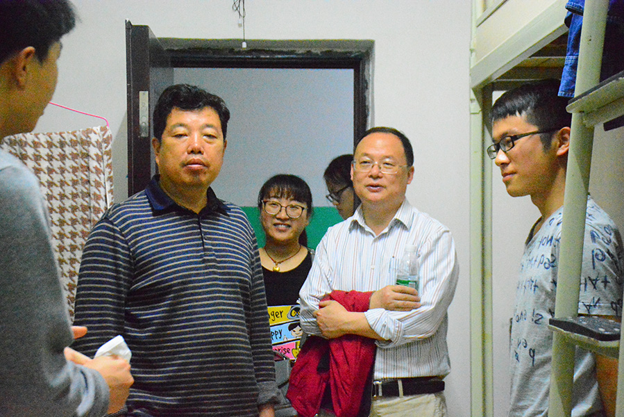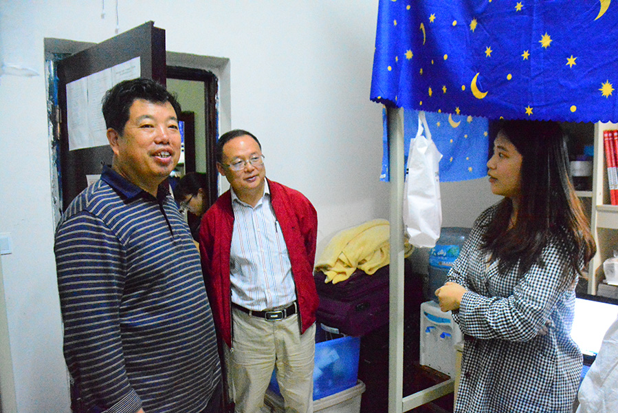 2018年5月10日晚上8:30公司党委书记熊文斌老师,党委副书记程安垣老师,辅导员任志君老师和辅导员助理周丽娟老师一起到将要毕业的大四学子们的寝室送去关心和问候,他们下寝去各个大四寝室查看同学们的情况。