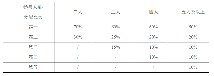 四、对有多人合作取得的成果,兼顾团队协作与主要贡献,分配比例如下(为充分考虑团队合作,表1中的三人以上比例和大于1):